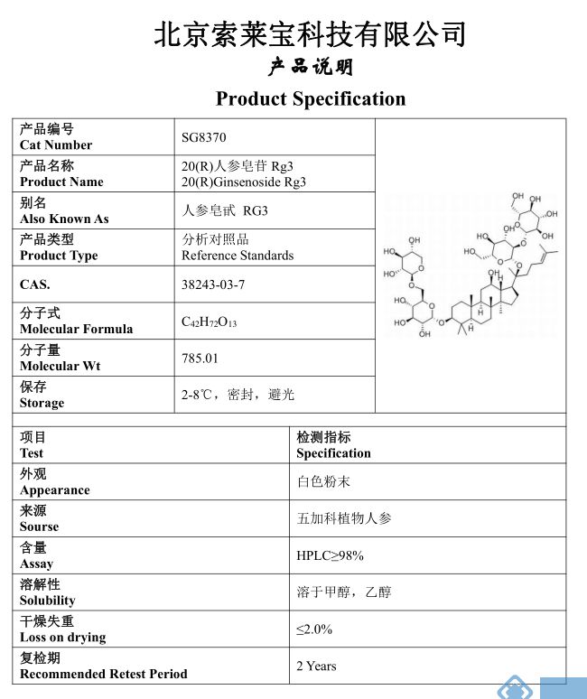 产品名称: 20(R)Ginsenoside Rg3;20(R)人参皂苷Rg3